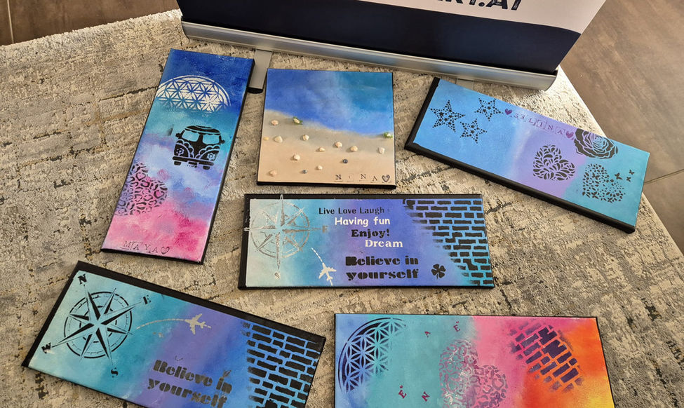 Du gestaltest ein Kunstwerk auf Leinwand (30x30cm oder 20x50cm) - mit richtig vielen Schablonen zur Auswahl - in deinen Lieblingsfarben - du wirst begeistert sein!